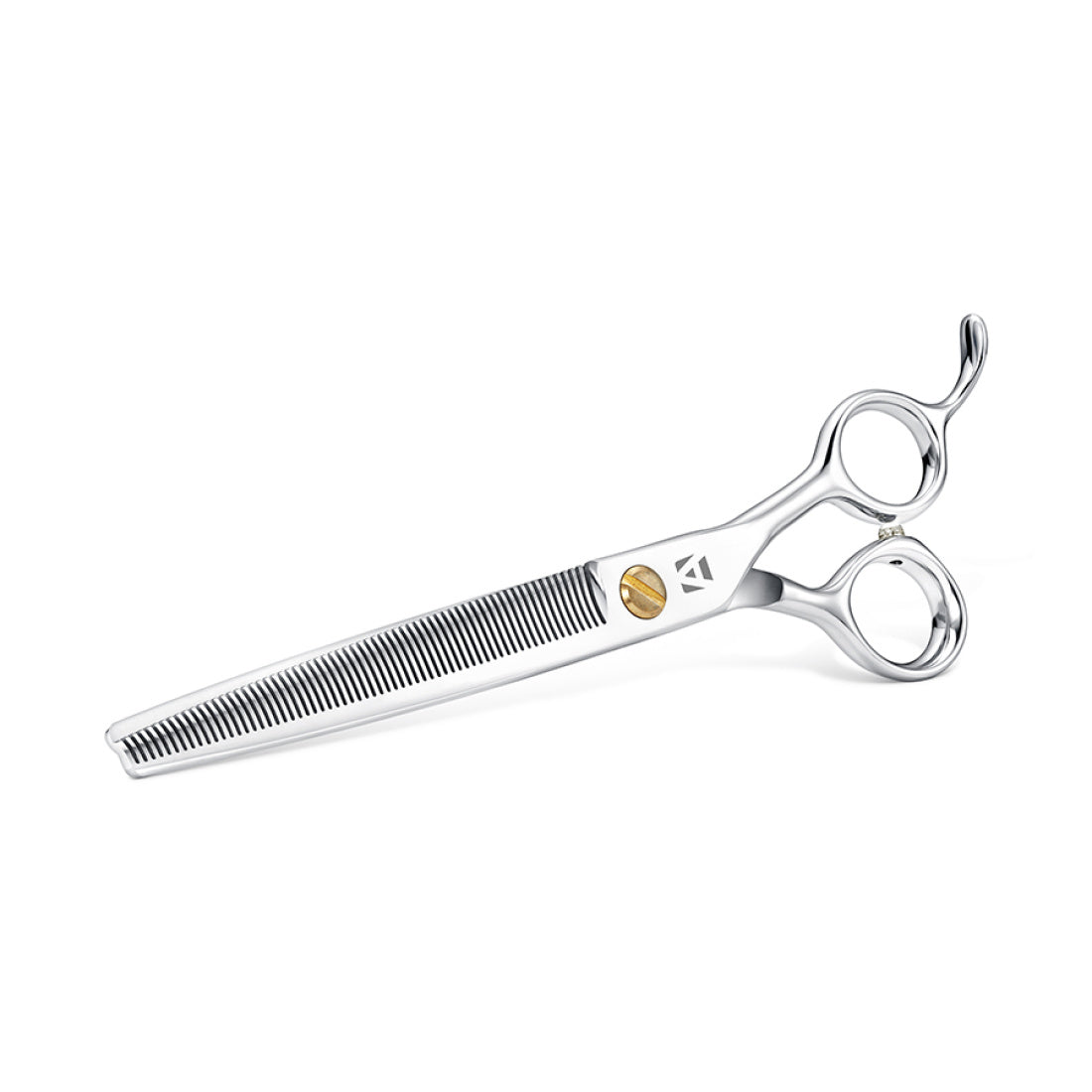 7.5-inch (19.5 cm) 65-tooth sculpting shears made from 440C Japanese steel. These scissors feature wide, thick blades and a high-grip thumbscrew for working with thicker coats. The short, semi-offset handle with integrated finger rest provides a wider blade opening for faster cutting. These scissors are ideal for blending and shading on medium- to large-sized dogs, or those with thicker coats.
