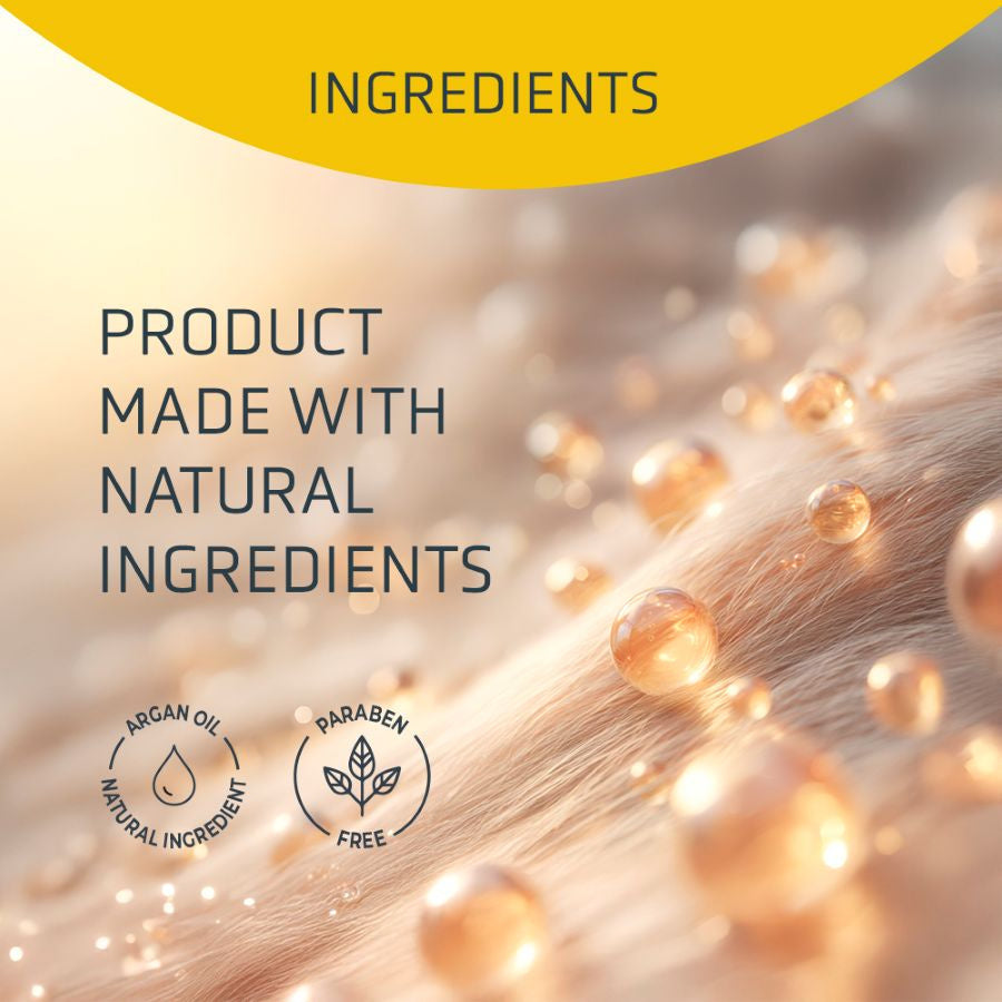 Moisturizing shampoo with argan oil, ideal for dogs with long, dry, or damaged hair. It provides shine, softness, and nourishment without drying out the skin.