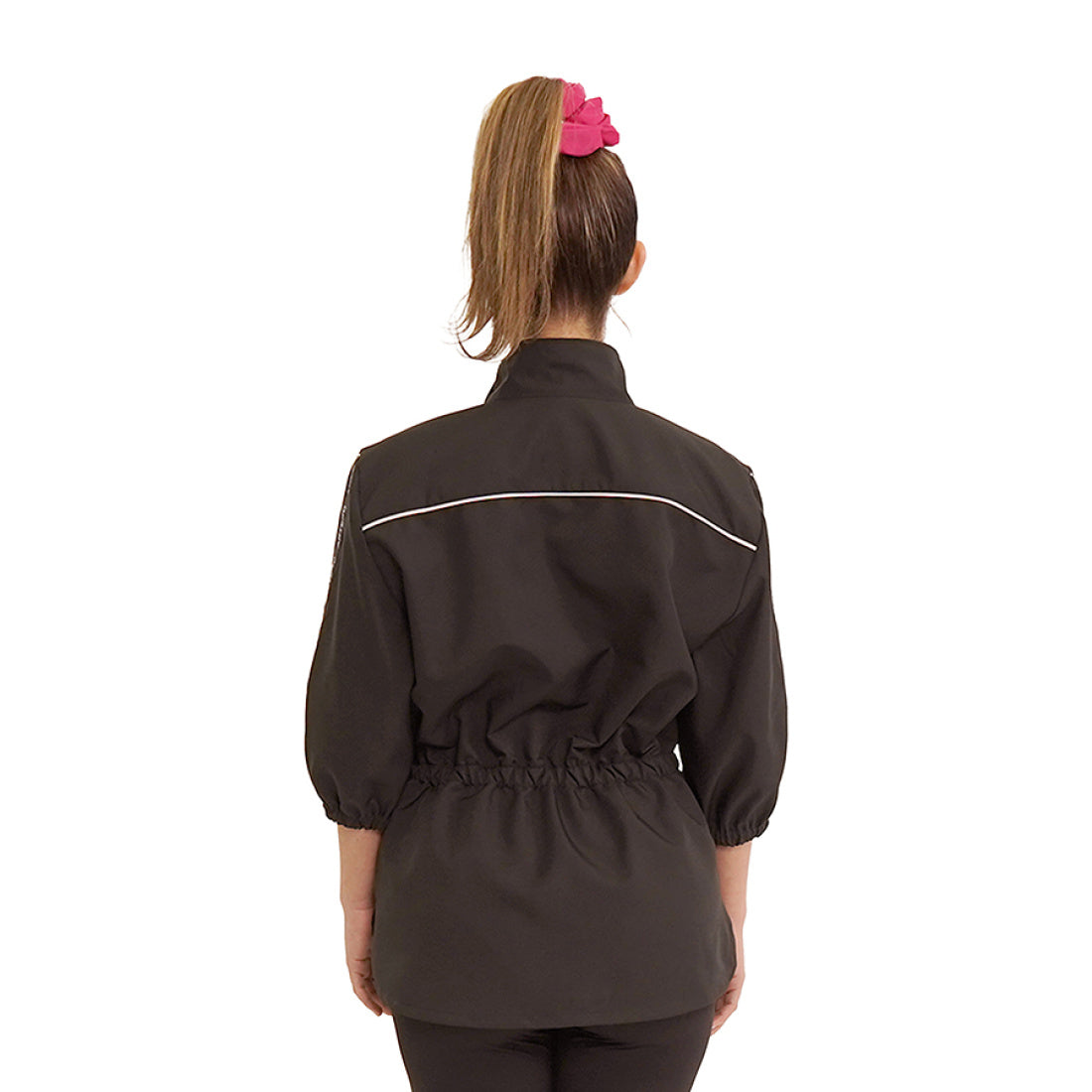 Feminine blouse with puffed sleeves in pink. Front closure with visible contrast snap buttons in fuchsia. Fuchsia details on seams. Sleeves with snap button closure. Peter Pan collar, rounded and uneven hem. Hair-repellent, breathable and comfortable fabric.