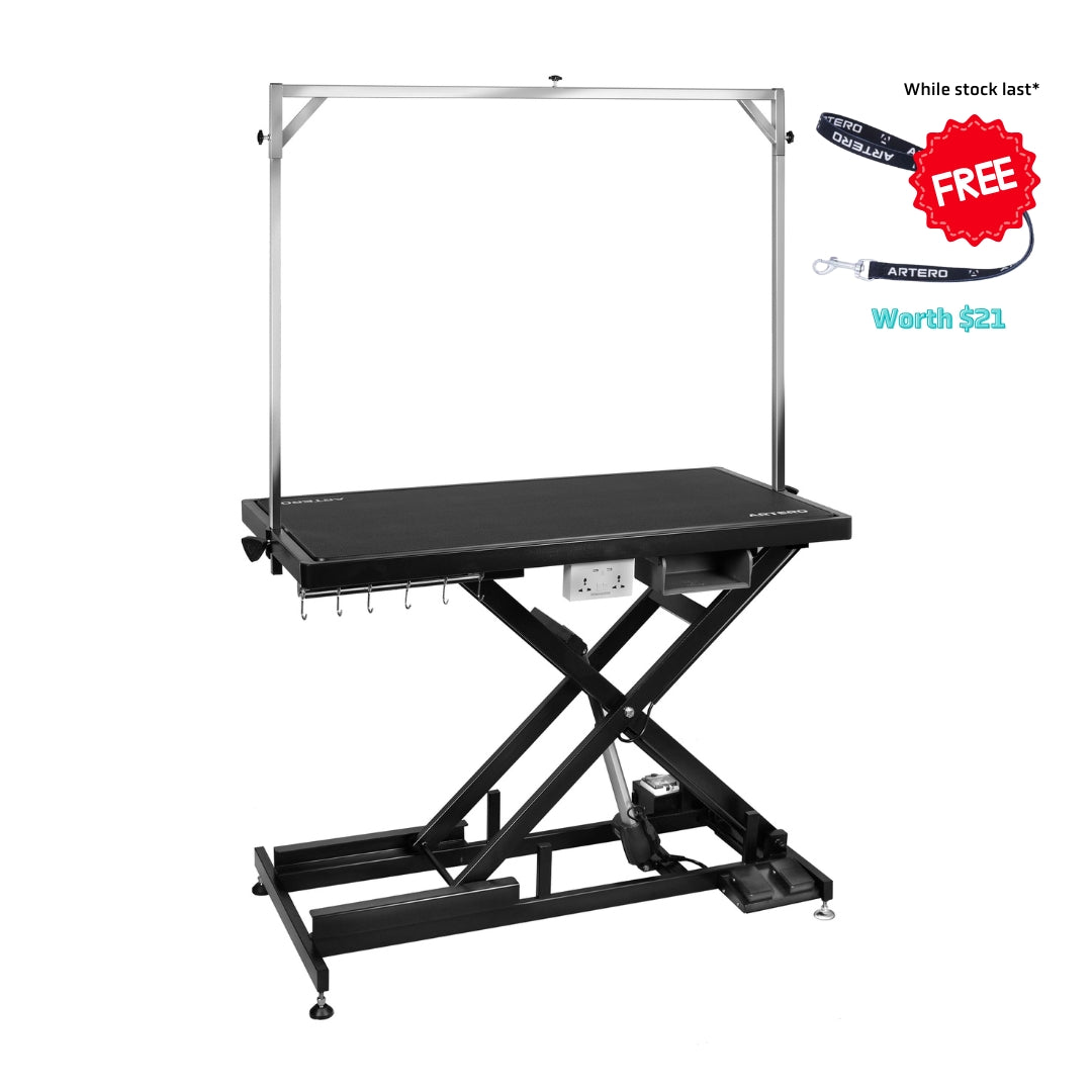 - Bottom board bar with 6 hanging hooks, machine, dryers, brushes, etc. and a tray for blades and utensils. Table with two sockets on the bottom centred part of the board.
