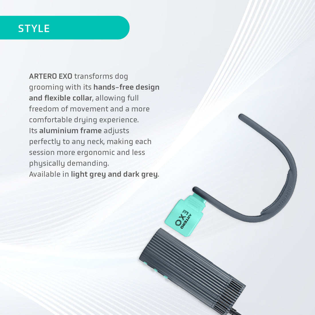 Neck-worn hairdryer with high air volume for drying and straightening pet hair.