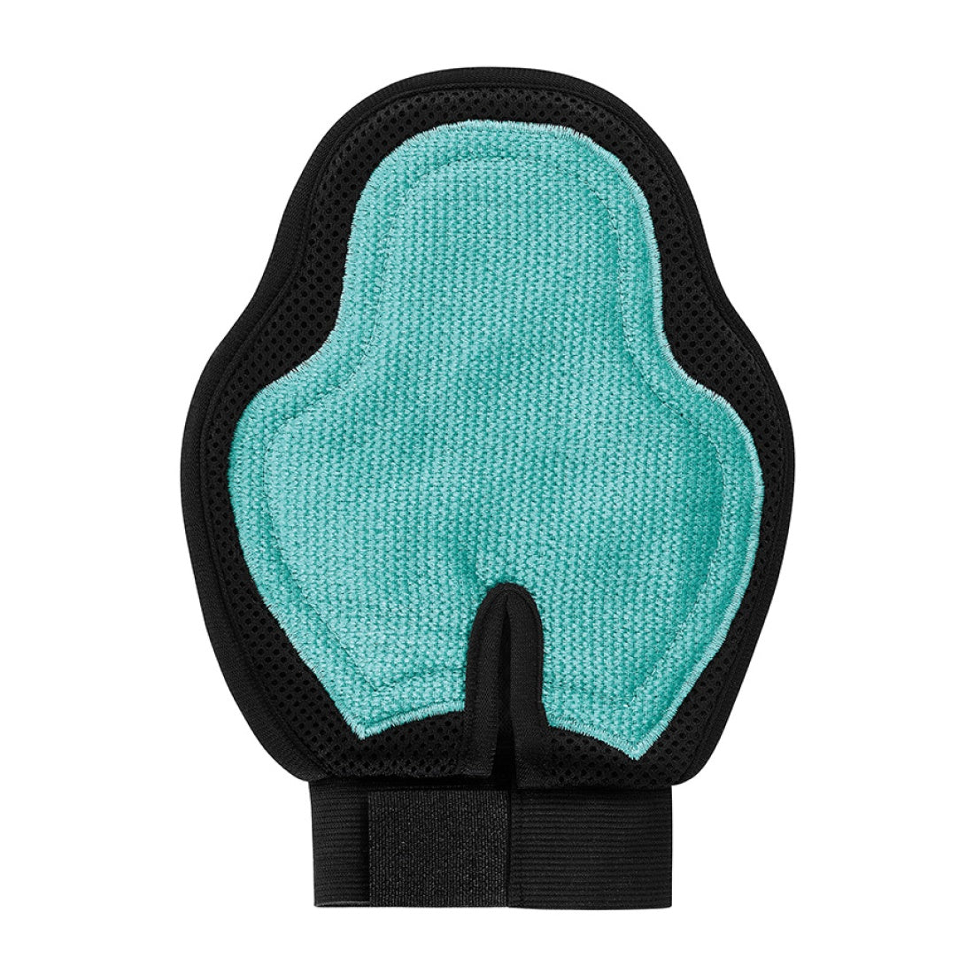 Double sidede glove made of synthetic breathable fabric, one side with hair-catching fabric and the other side with rubber spikes to remove shedding hair from the coat.