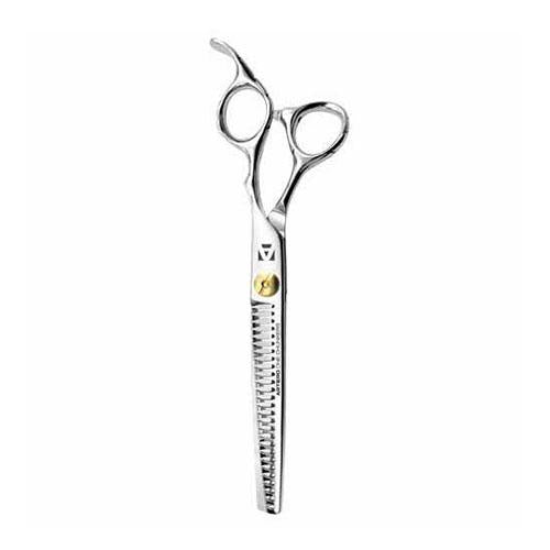 This scissor is composed of one razor-blade edge while the other blade has very wide teeth.