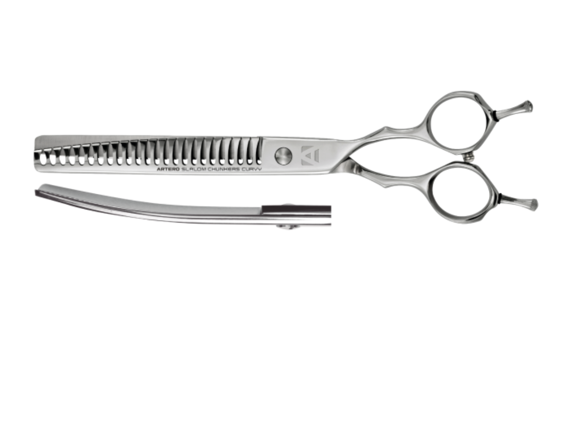 Professional sculpting grooming scissors with curved blades.