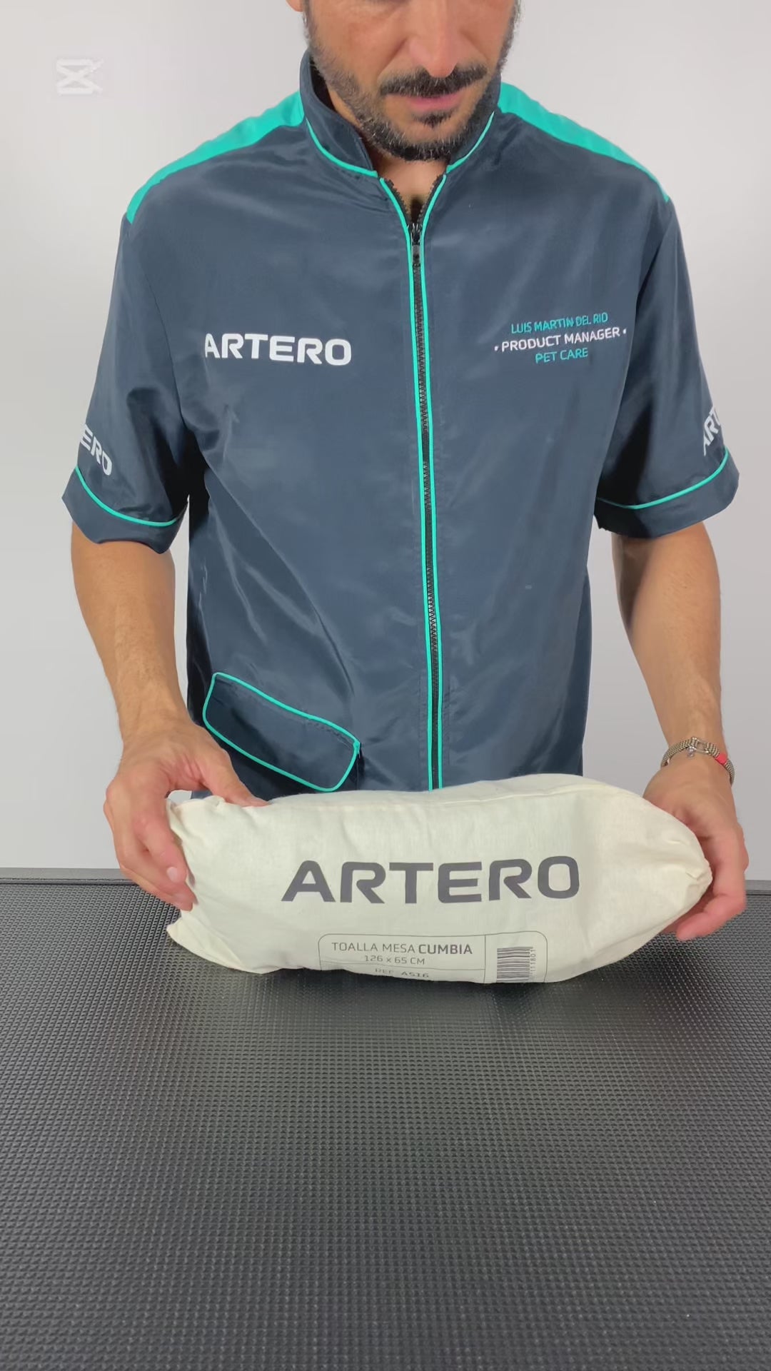 Turquoise microfiber towel with an embroidered Artero logo for covering your tabletop. Easy to use, it fits snugly around the edge like a sheet. It narrows on the two shorter sides to allow space for the base of the metal arms. Ideal for the Artero Premium table, but also compatible with 120x60cm tables. This towel absorbs dripping water from dogs and cats during drying, achieving a faster result and avoiding unnecessary humidity in the environment